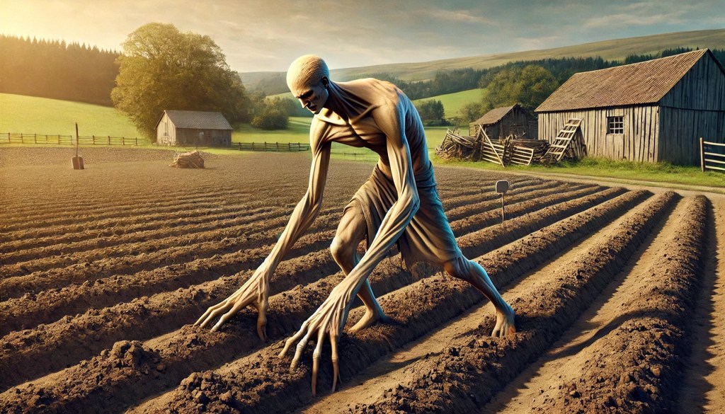 DALLE Prompt: Please show me a fictional human that descends from a long line of farmers that have evolved shovel spades for hands instead of normal hands. His arms are also much longer and stronger than a typical human, but are entirely made of skin and bone. Show him preparing a field with his bizarre shovel arms in a manner that belies no ability for introspection or reasoning.