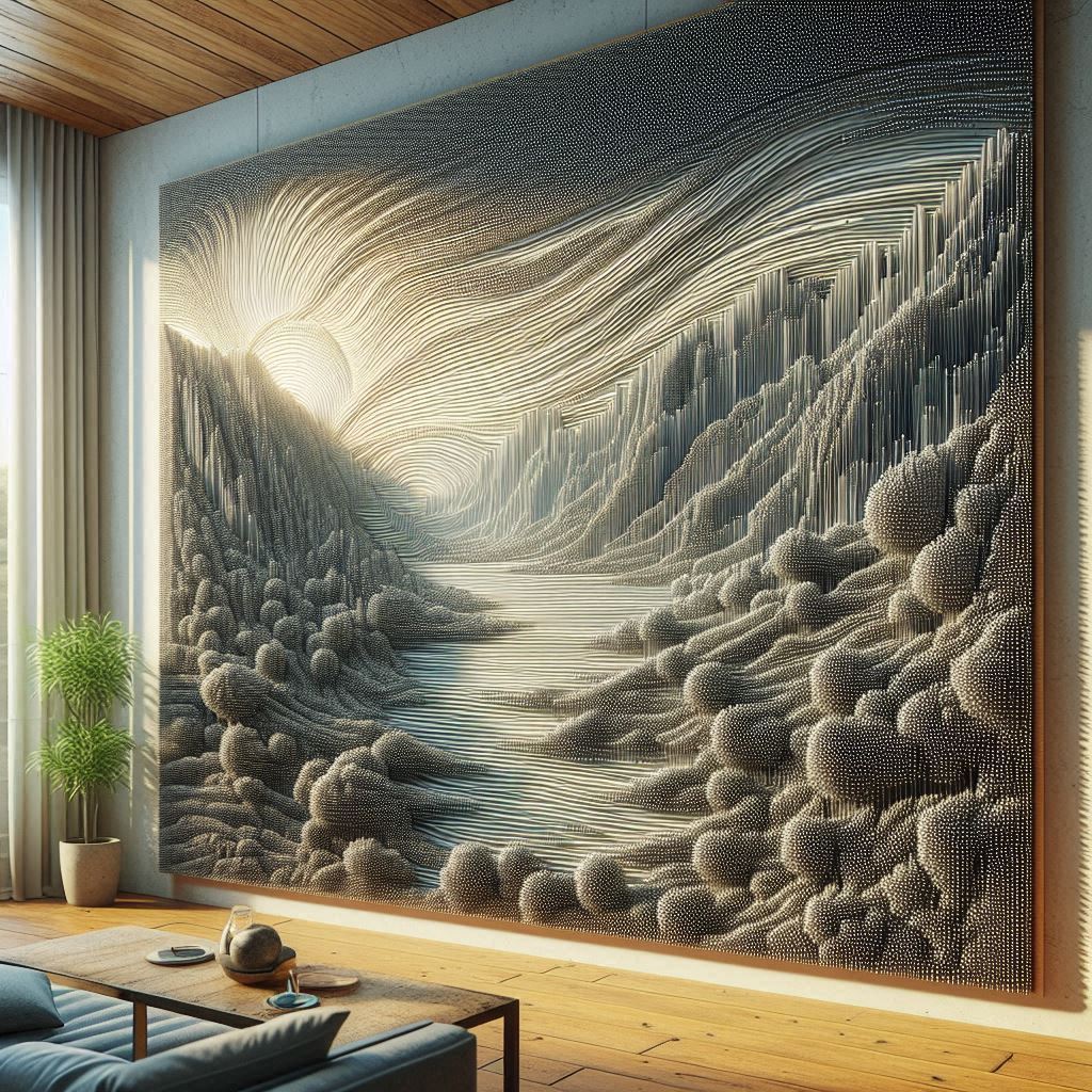 MS Designer Prompt: Imagine a wall of an apartment building made entirely of a single, large pin art board. Show this wall with an impression in the pins depicting a landscape with breathtaking detail, as seen from the inside of a room sharing this wall with another room.